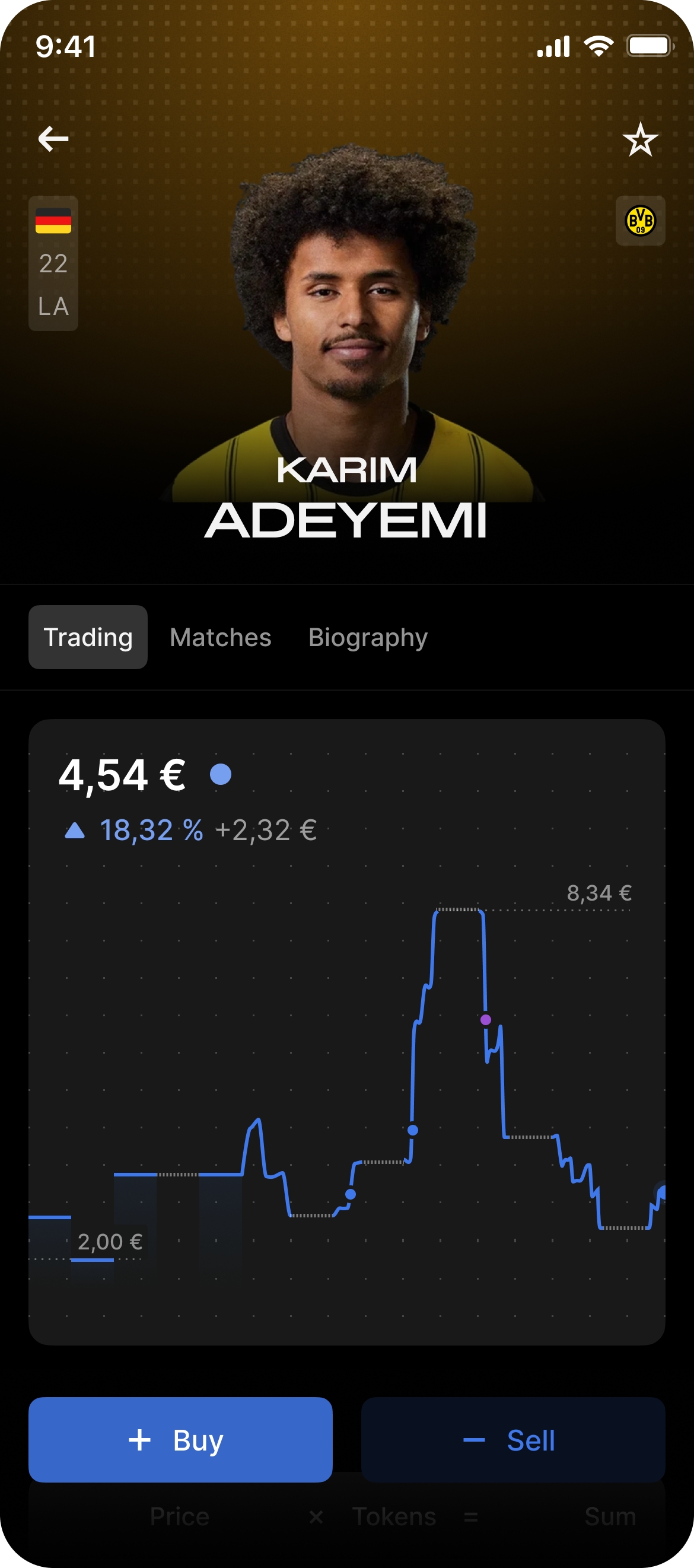 In der App findest du alle verfügbaren Vereine und Spieler im Bereich Market. Wähle einen Verein/Spieler aus, um dir seinen aktuellen Tokenpreis, die Anzahl verfügbarer Tokens und die Performance anzusehen.
