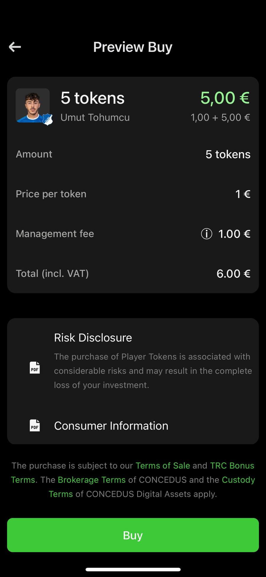 Dir wird der aktuelle Preis pro Token und der Gesamtpreis (inkl. der fixen €1-Transaktionsgebühr) angezeigt.