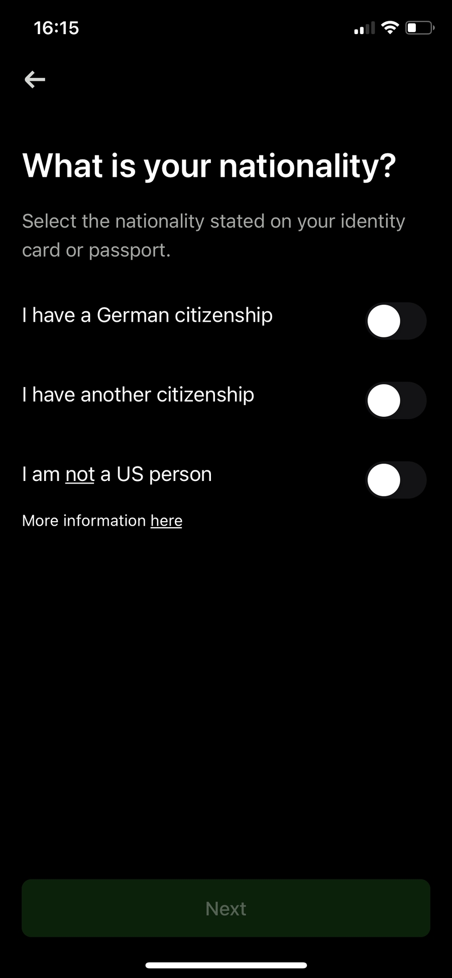 Um auf unserer Plattform handeln zu können, muss unser Finanzdienstleister deine Identität verifizieren – dies ist eine gesetzliche Vorgabe des deutschen Geldwäschegesetzes (GwG). Die Verifizierung kannst du ganz bequem jederzeit und von überall über die App durchführen.
